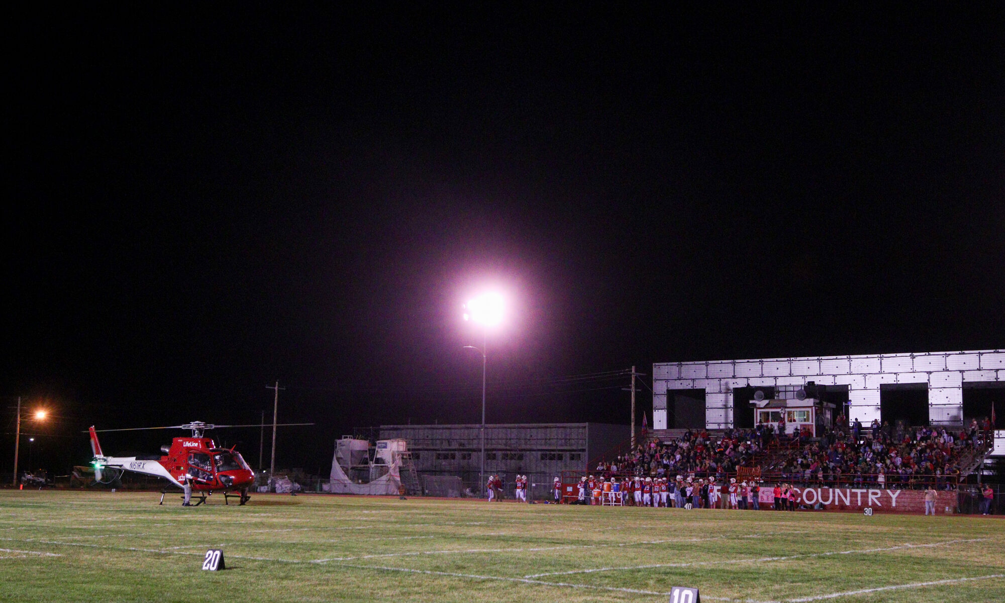On Saturday night in Baca County, in far southeastern Colorado, the Springfield Longhorns hosted the Holly Wildcats at Aaron Hale Field. Holly came in at 3-2, while Springfield were 2-3. The game was set for kickoff at 7pm. Pending the delivery of a game ball from a LifeLine helicopter in a pregame ceremony. Though, that was delayed until well after 7pm.